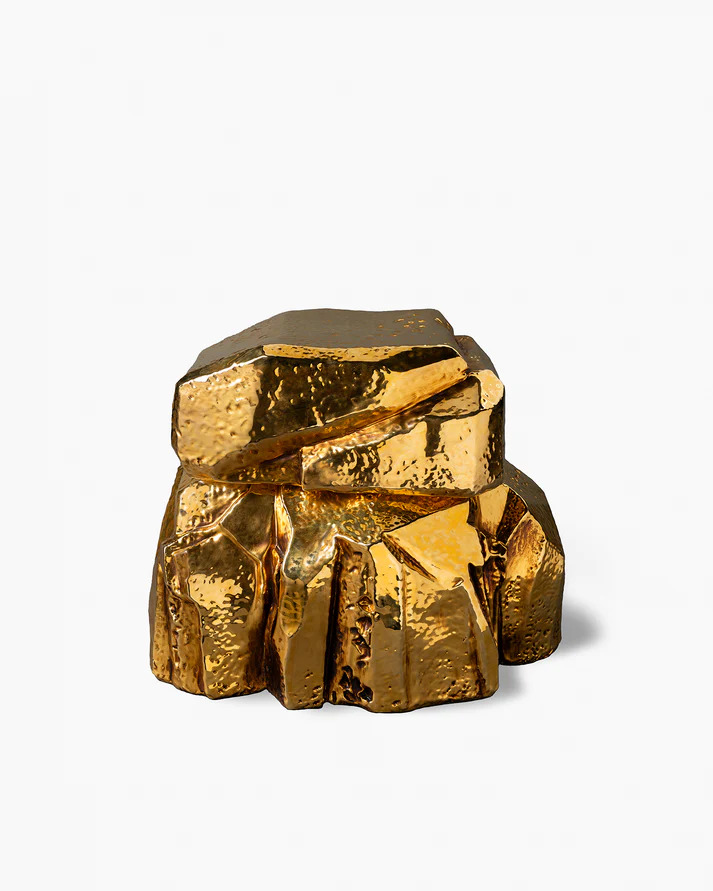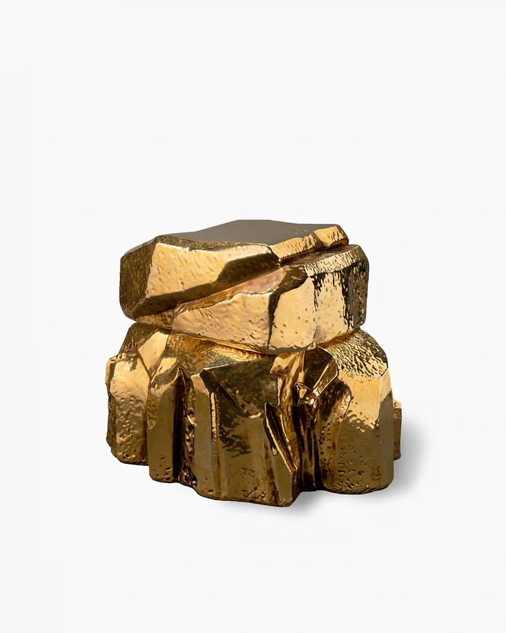 白い粘土を用いて手作業で成形された2つのパーツから構成され、まだ柔らかい状態の表面に手作業で刻みや凹凸が施されています。白釉を施した後、さらに金の釉薬で仕上げることで、質感のコントラストと奥行きのある表情を生み出しています。アートピースのように空間を引き立てるインテリアアイテムです。