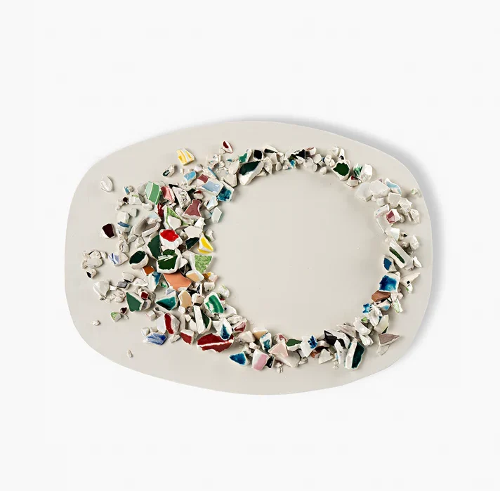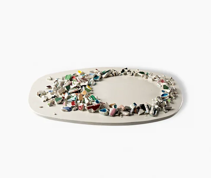 本作「Centrotavola Ovale」は、デザイナーDuccio Maria Gambiが手がけた「Era」コレクションの一作で、廃棄されるはずだった陶器の断片に着想を得た、再生と実験をテーマにしたプロジェクトです。