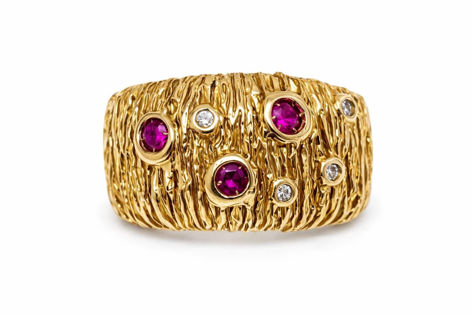 Anello in Oro Rosso 750 mill. は、繊細で美しい金細工が施されたエレガントな18Kレッドゴールドの指輪です。3石のルビーと、合計0.05カラットのホワイトダイヤモンドで装飾されていて、エレガントな輝きを放っています。高品質な素材を使用しているので長くご愛用いただけます。贈り物としてもおすすめです。指先を華やかに彩ってくれる、色々なスタイルに合わせやすいジュエリーです。