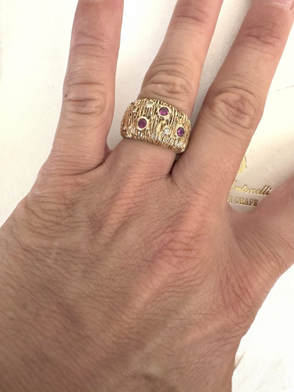 Creazioni Orafe di Luisa Antonelli クレアッツィオーニ・オラフェ・ディ・ルイーザ・アントネッリは、ハンドメイドのジュエリー工房で、高度な伝統技法とモダンなデザインが見事に融合した高級ジュエリーを作っています。Anello in Oro Rosso 750 mill. は、ルビーとダイヤモンドが埋め込まれた18Kレッドゴールドの指輪です。繊細な金細工と美しい宝石が指先を華やかに彩ってくれます。