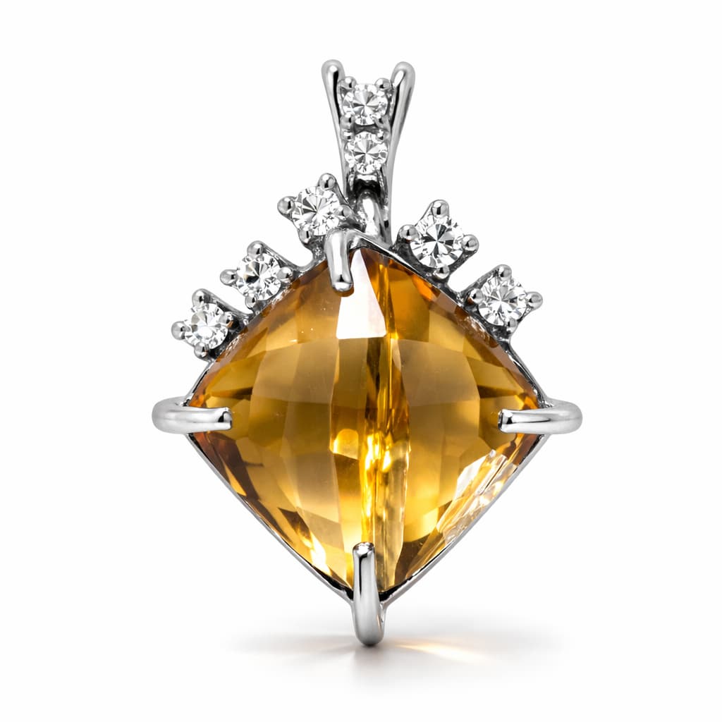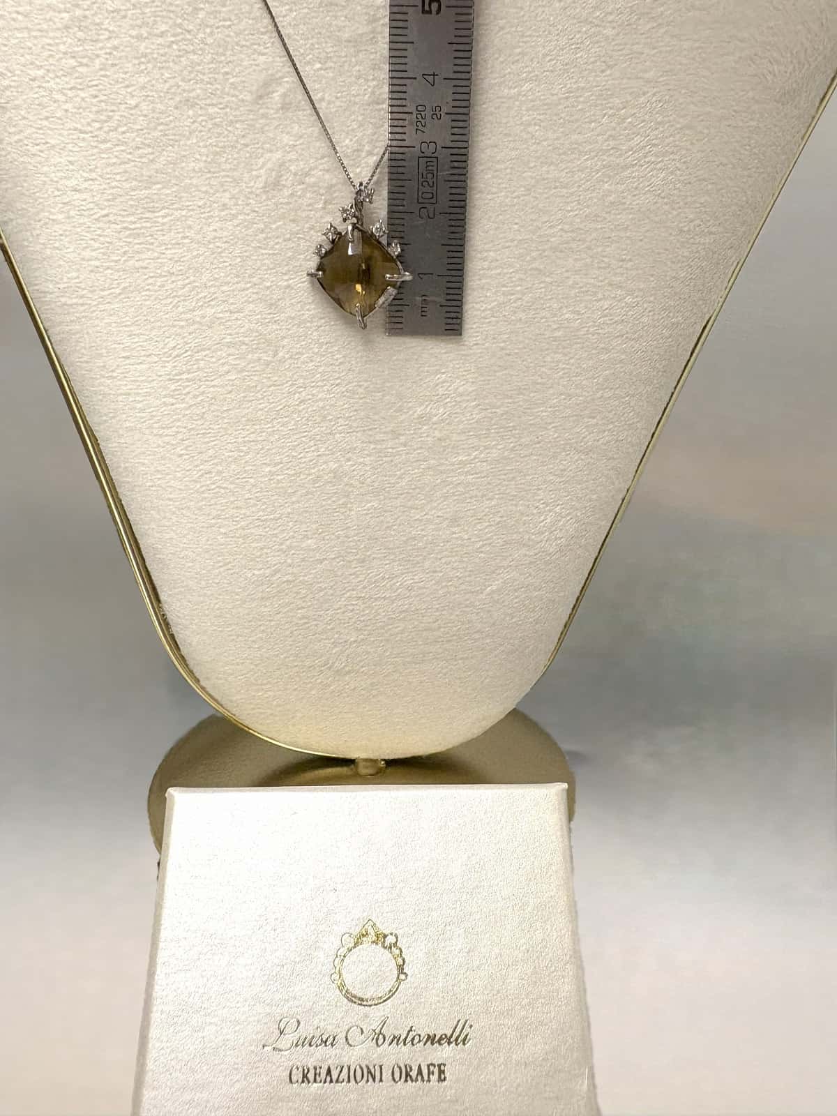 Creazioni Orafe di Luisa Antonelli クレアッツィオーニ・オラフェ・ディ・ルイーザ・アントネッリは、ハンドメイドのジュエリー工房で、伝統と革新を融合させた高級ジュエリーを制作しています。Ciondolo in Oro Bianco 750 mill. は、18Kホワイトゴールドのシンプルでエレガントなペンダントです。クッションカットの大きなシャンパンクォーツが特徴的な、落ち着いた色合いの上品なジュエリーです。