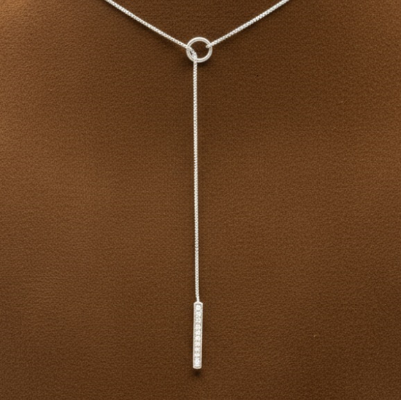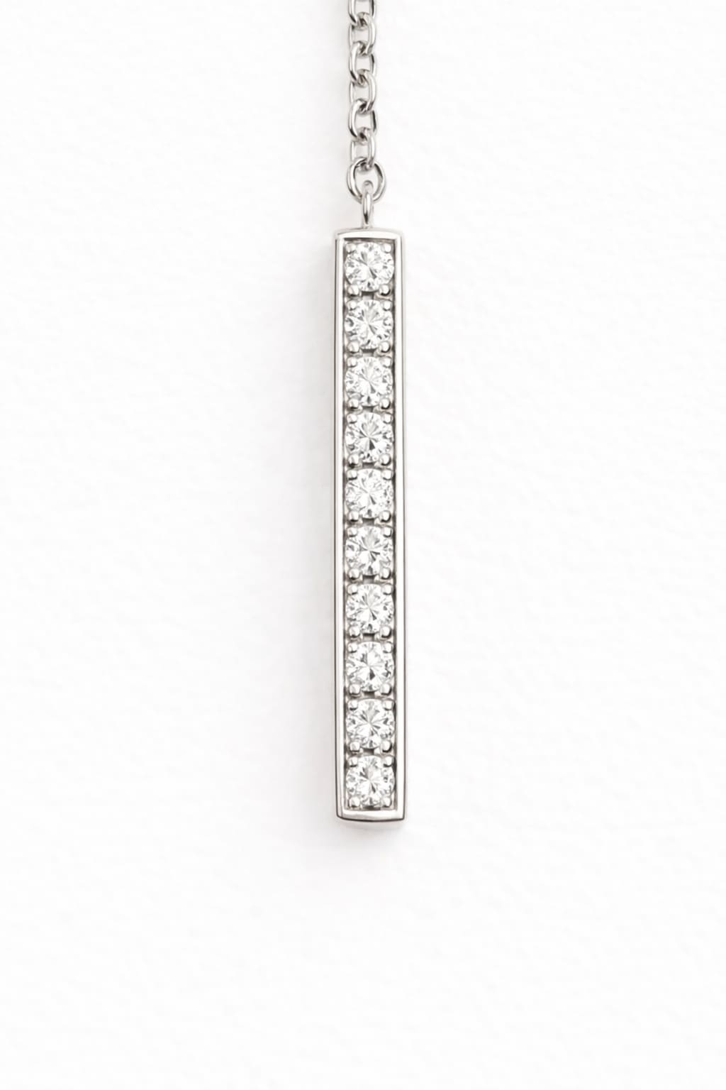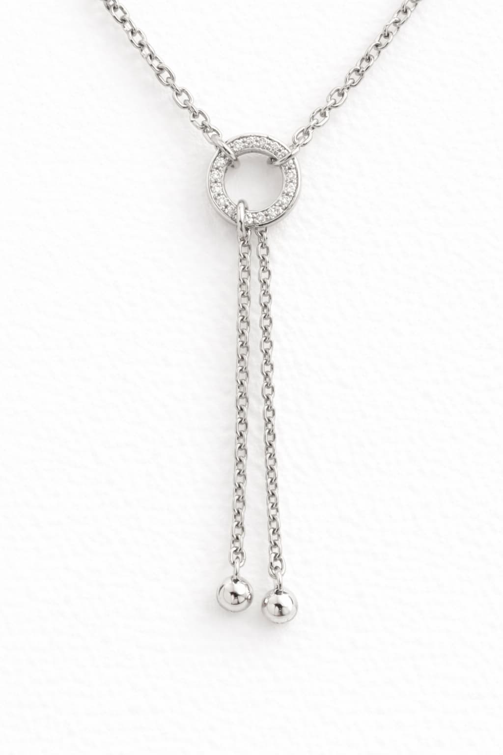 Collana saliscendi in Oro Bianco 750 mill. は、18Kホワイトゴールドのスライド式ネックレスです。合計0.33カラットのホワイトダイヤモンドが敷き詰められています。高度な技術が際立つパヴェセッティングのジュエリーです。長さは約65cmで、チェーンはスライド式の長さ調節が可能なデザインとなっています。シンプルでありながらエレガントなデザインで、どんなスタイルにも合わせやすく、日常使いから特別な場面までさまざまなシーンでお使いいただけます。ダイヤの輝きが胸元を引き立ててくれるラグジュアリーなネックレスです。