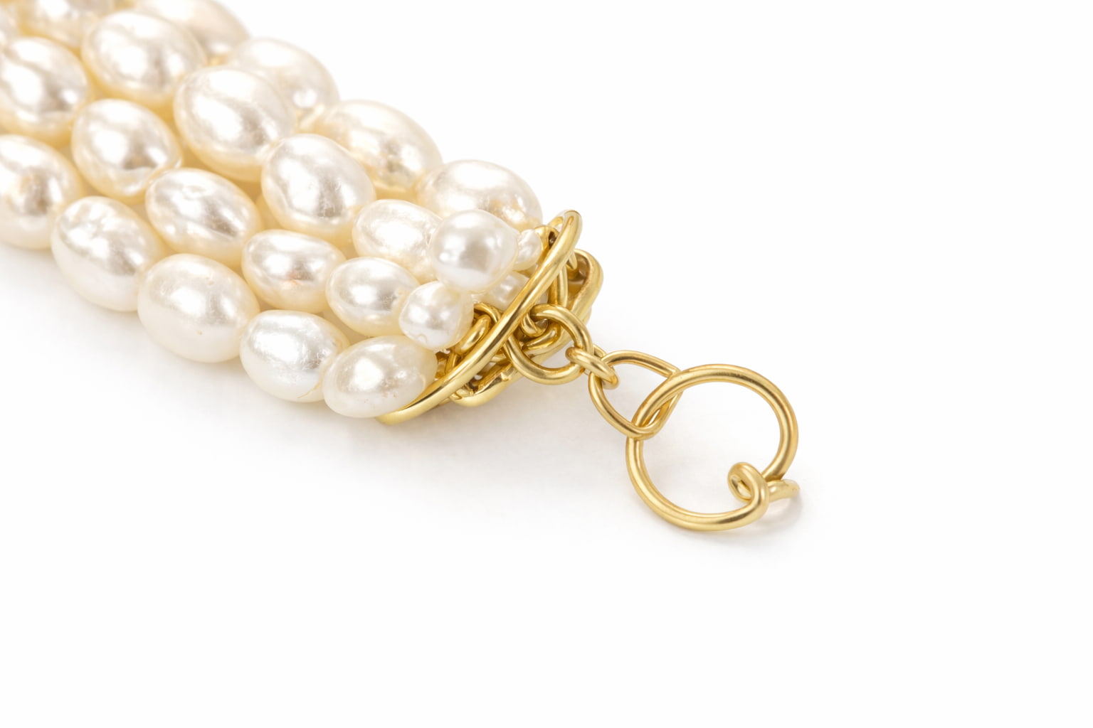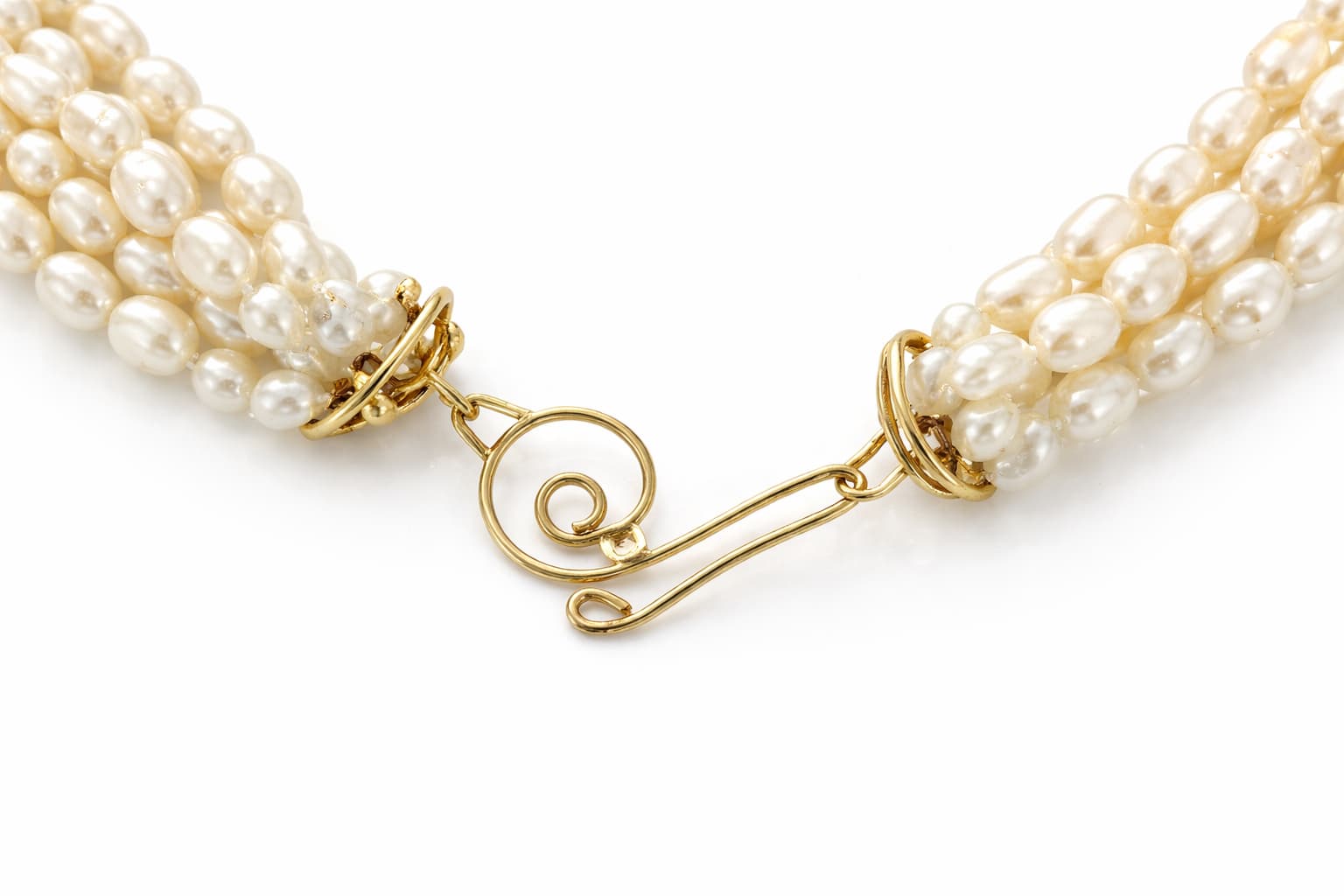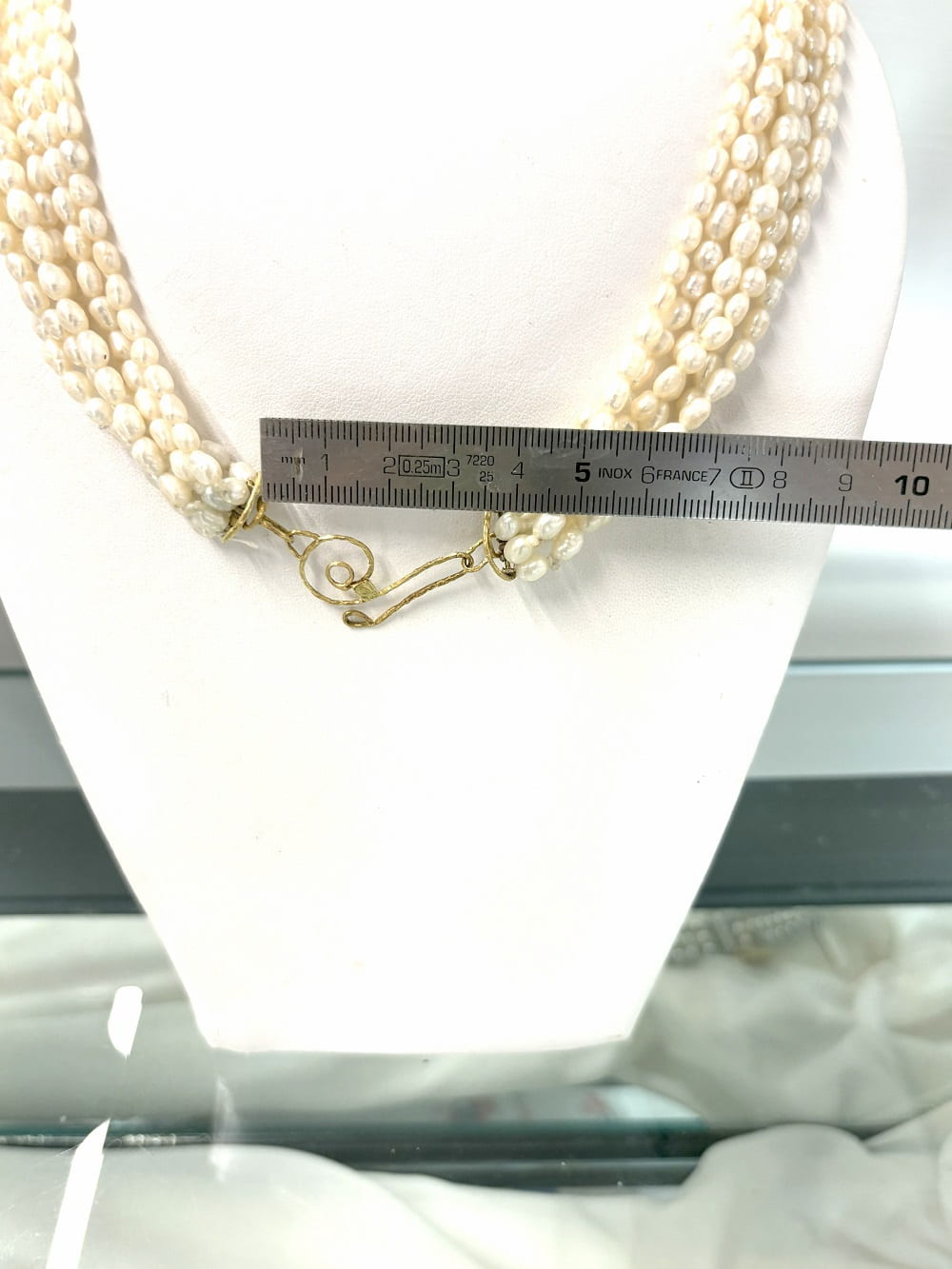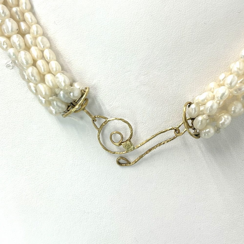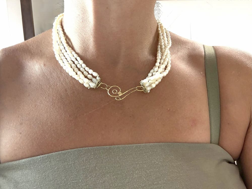 Collana di Perle di fiume bianche con centrale in Oro giallo 750 mill. は、白い淡水パールの上品なネックレスです。18Kイエローゴールドの装飾には職人技が光るハンマー仕上げのお洒落なワイヤーデザインが施されていてセンスを際立たせています。高品質なパールの光沢はとても美しく高級感があり、特別な日やご自身へのご褒美、ギフトとしてもおすすめのジュエリーです。