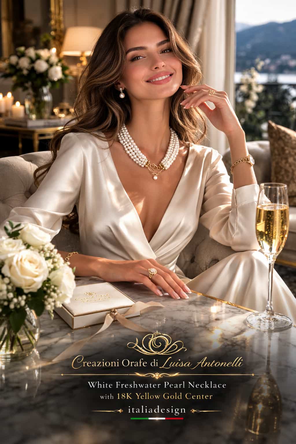 Creazioni Orafe di Luisa Antonelli クレアッツィオーニ・オラフェ・ディ・ルイーザ・アントネッリの製品は、高度な伝統技法を活かした芸術性の高いデザインの高級ジュエリーです。Collana di Perle di fiume bianche con centrale in Oro giallo 750 mill. は、美しい光沢の淡水パールのネックレスです。K18ゴールドの繊細な装飾もお洒落です。