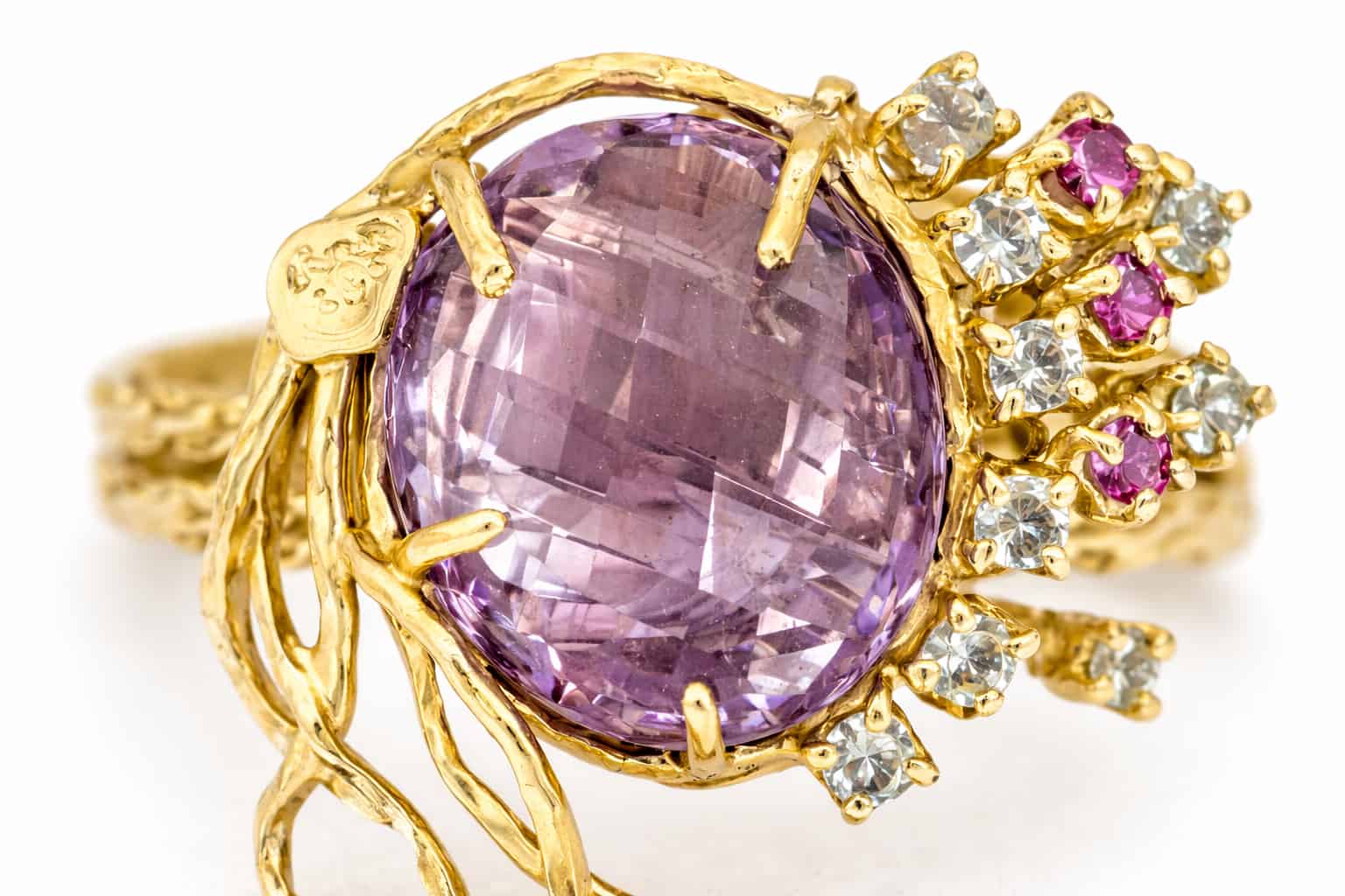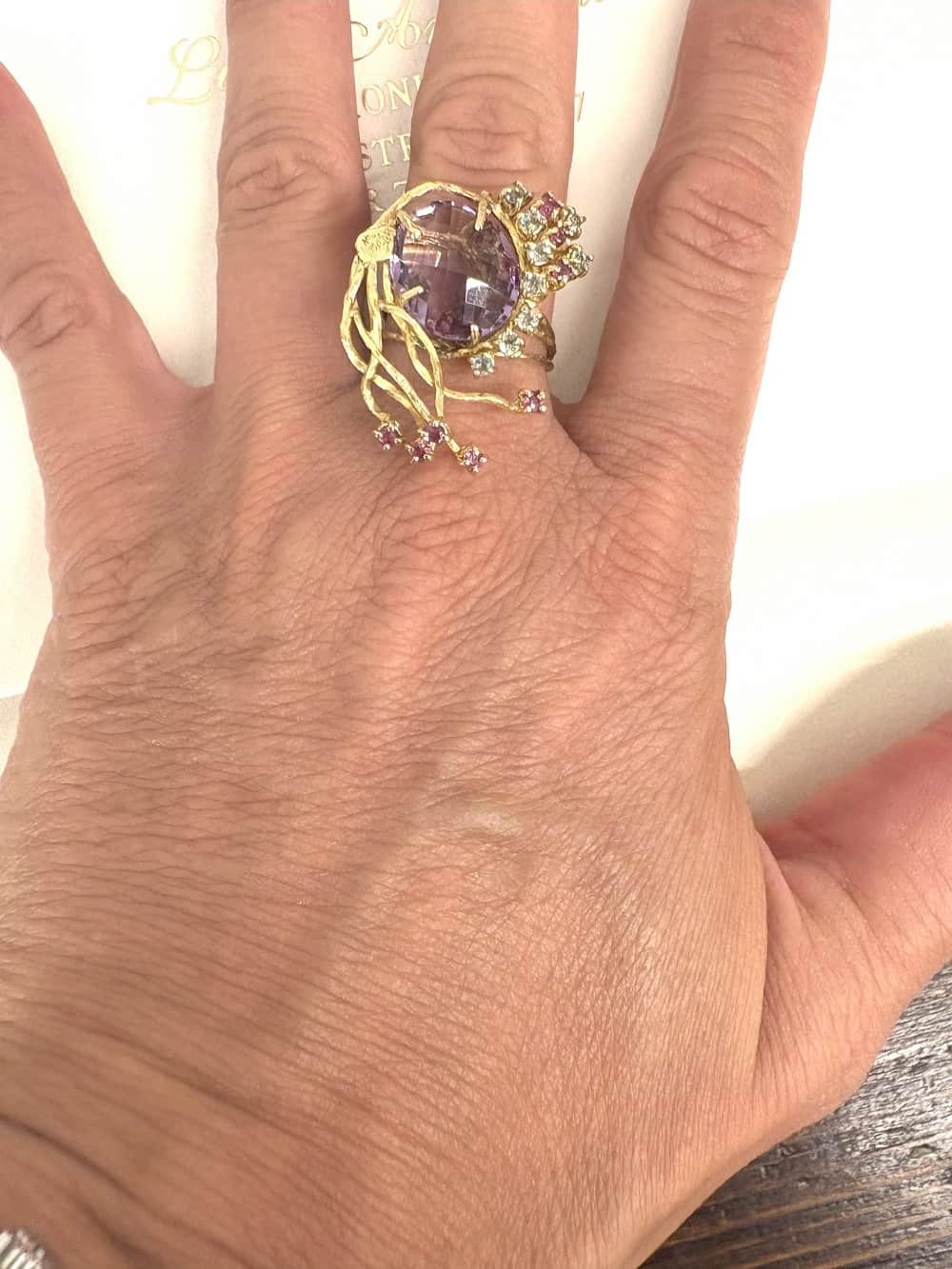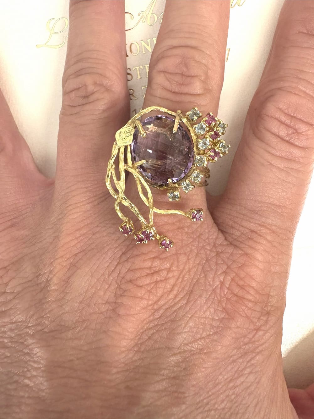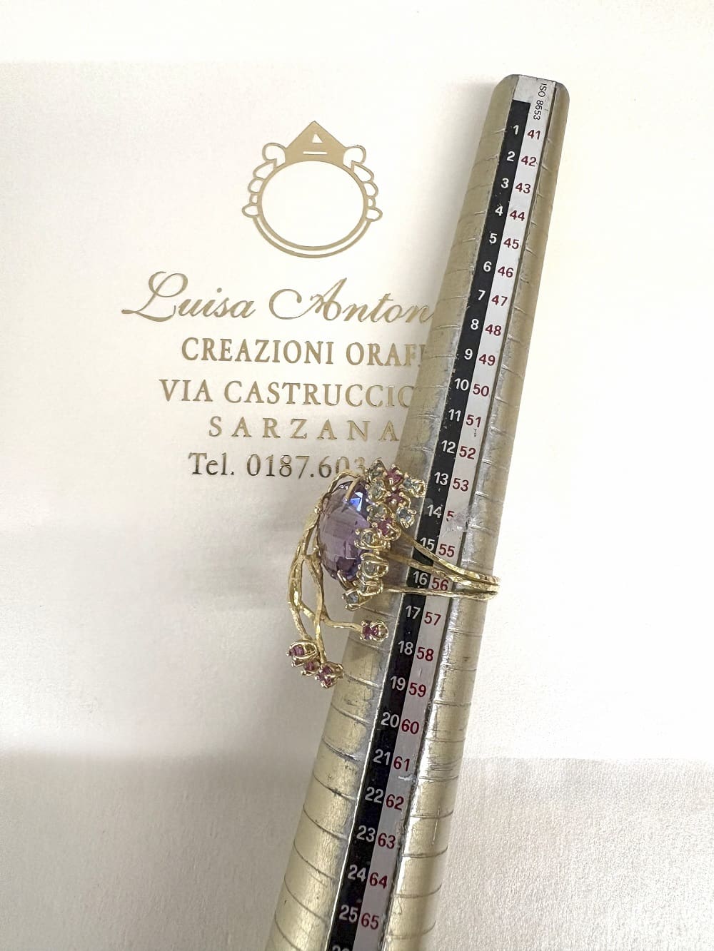 Creazioni Orafe di Luisa Antonelli クレアッツィオーニ・オラフェ・ディ・ルイーザ・アントネッリは、18金や宝石を使った高級ジュエリーをハンドメイドで制作しているイタリアのジュエリー工房です。Anello in Oro Giallo 750 mill. は、アメジスト、ルビー、アクアマリンで装飾されたエレガントで芸術的な18Kイエローゴールドの指輪です。